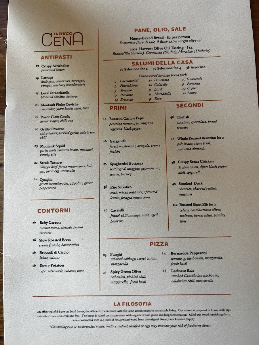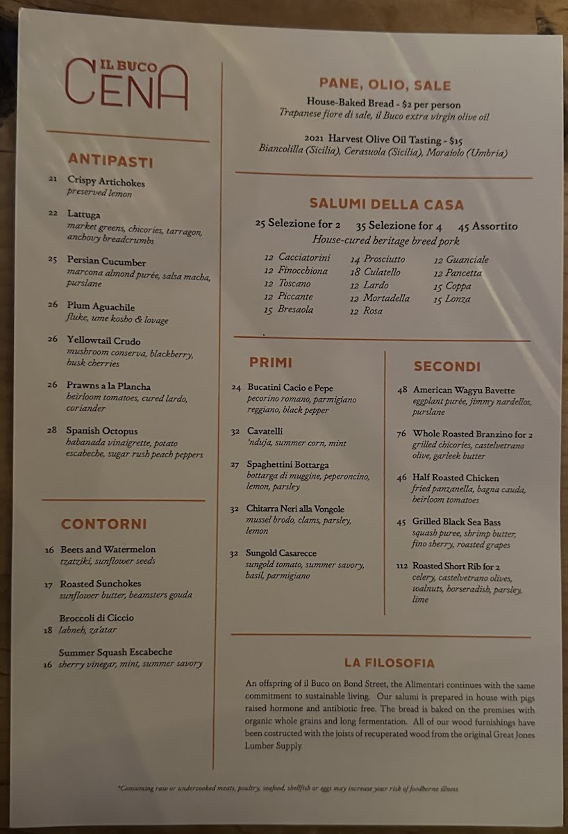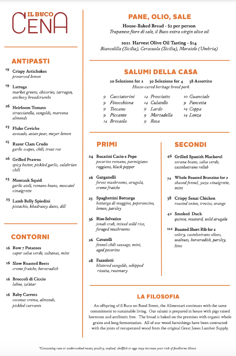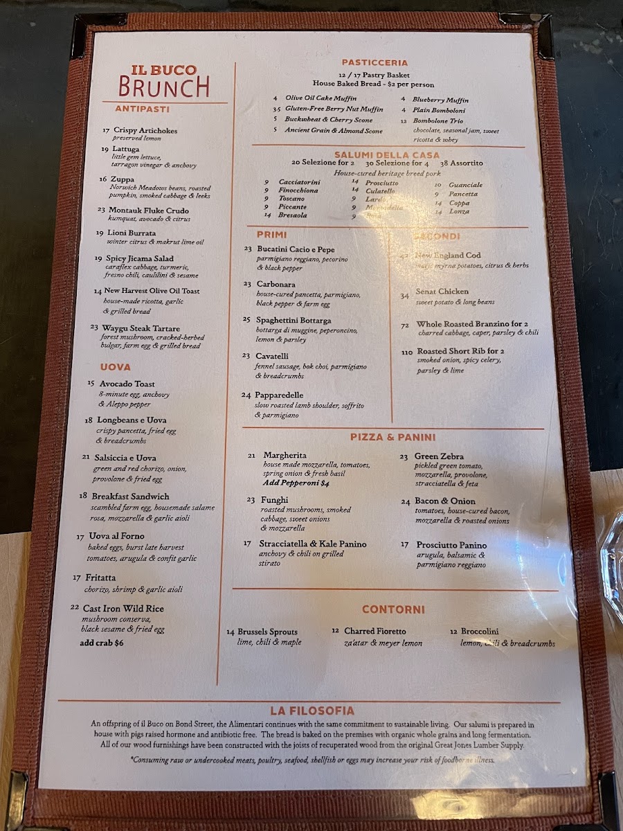 Il Buco Alimentari & Vineria is a vibrant Italian spot in the heart of New York, offering an elegant blend of rustic market charm and refined dining. The menu highlights freshly baked breads like buckwheat and rosemary potato focaccia, crafted daily with authentic ingredients. Breakfast selections such as the housemade sandwich with Nardello sweet pepper spread and sunny-side eggs showcase thoughtful flavor combinations.